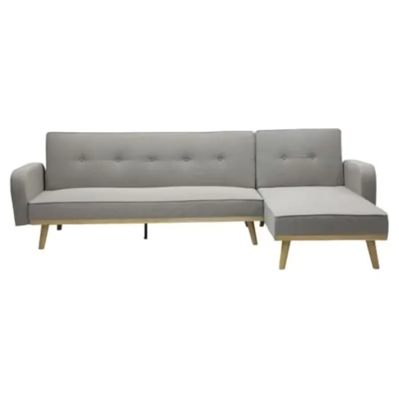 3-seater corner sofa bed in beige and light grey fabric with wooden legs. Convertible design ideal for living rooms, bedrooms, or small rooms. Classic style, comfortable, durable, and space-saving. Perfect for modern or compact interiors.