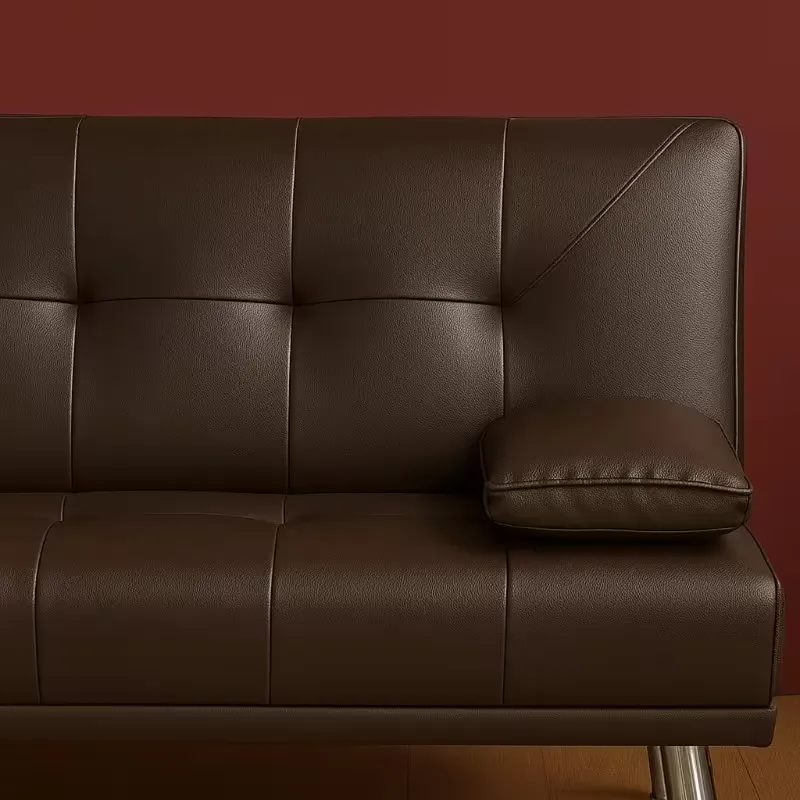 Karna corner leather sofa bed futon with faux leather upholstery, convertible design, and comfortable seating. Features cup holders and armrest, ideal for living rooms or small spaces. Space-saving, stylish, and multi-functional for lounging or sleeping.